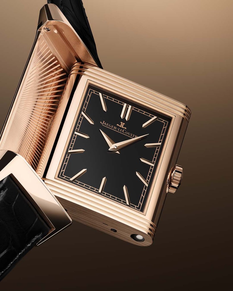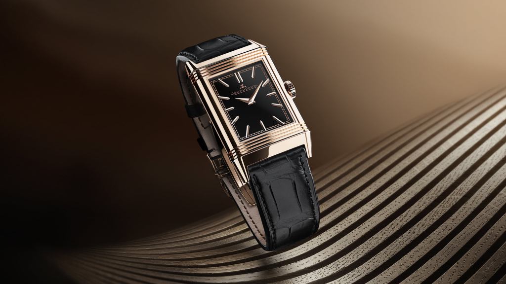 The dial of the Reverso Tribute Enamel features the same opaque black Grand Feu enamel as the case back. The elegant simplicity of the Reverso Tribute dial, with its faceted appliqué hour-markers, chemin de fer minutes track, and Dauphine hands – in this case, perfectly matched to the pink gold of the case – places full value on the subtle beauty of the glowing black background.