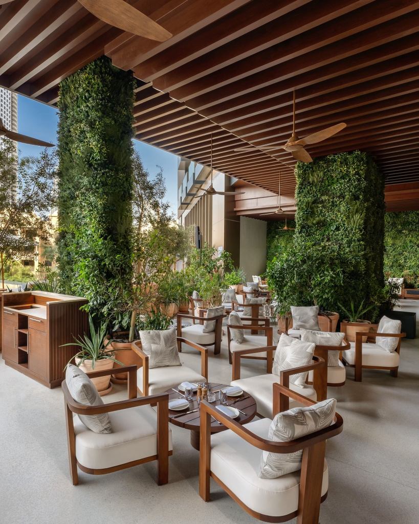 From the outside, The Dubai EDITION stands tall within the Downtown district surrounded by world-famous attractions and landmarks. The green-filled entrance to the hotel is populated with bold terracotta pots transporting guests from the hustle and bustle to an oasis of calm. The clever landscaping continues throughout the hotel into the lobby, outdoor spaces and terraces, shaping intimate venues complete with lights beautifully woven through the gardens to create a playful dance at night.