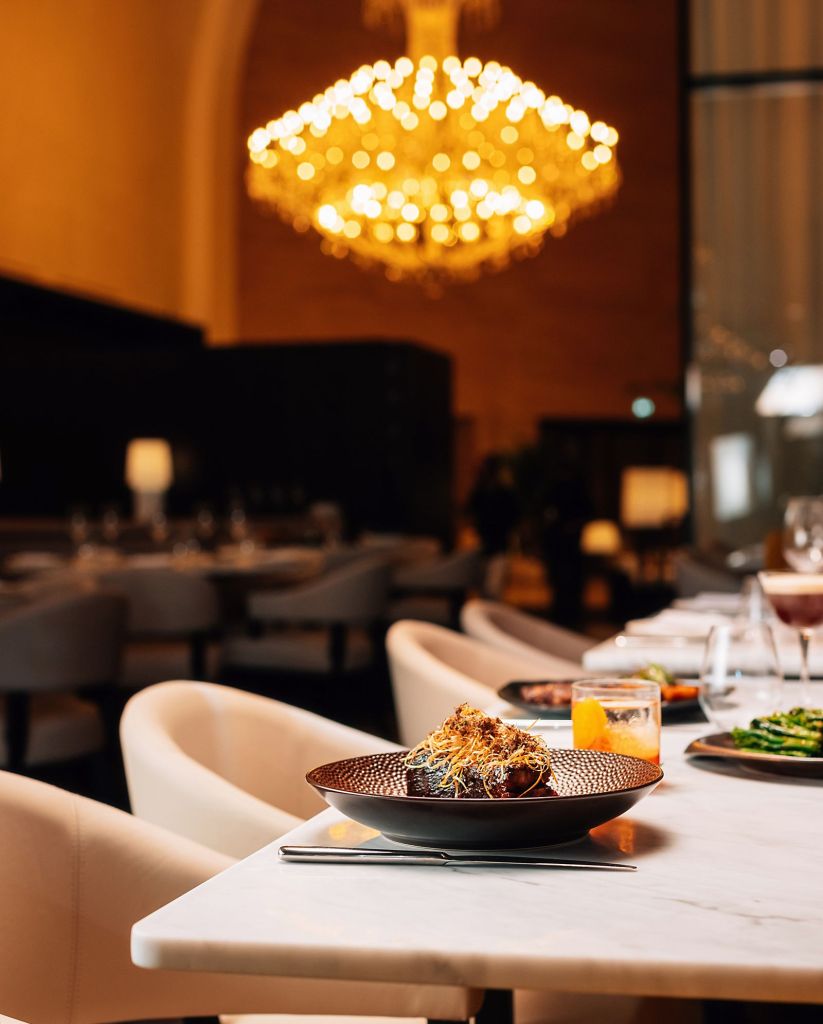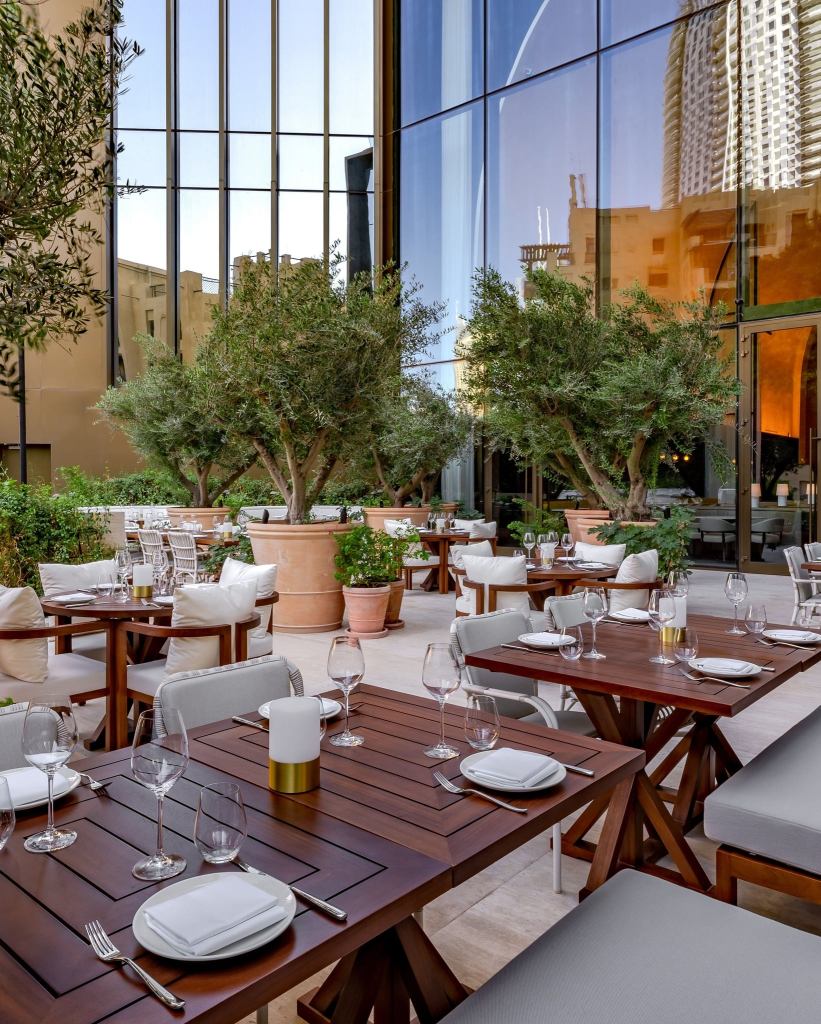 Accessible from the lobby, the ground floor is home to Duomo, the theatrical Italian restaurant serving modern interpretations of the traditional cuisine. Natural light fills the space through floor to ceiling windows highlighting the pop of yellow in the velvet furnishings, a clear design departure from the natural-toned lobby. Abstract digital art is projected onto the dome ceiling above creating an interactive and encompassing dining experience from the surroundings to the plate. The outdoor terrace is adorned with large potted olive trees and lit by lanterns at night with views of the tallest building in the world, the Burj Khalifa, in the near distance.