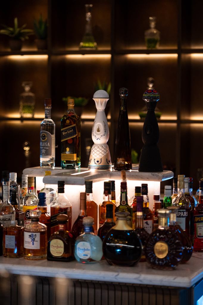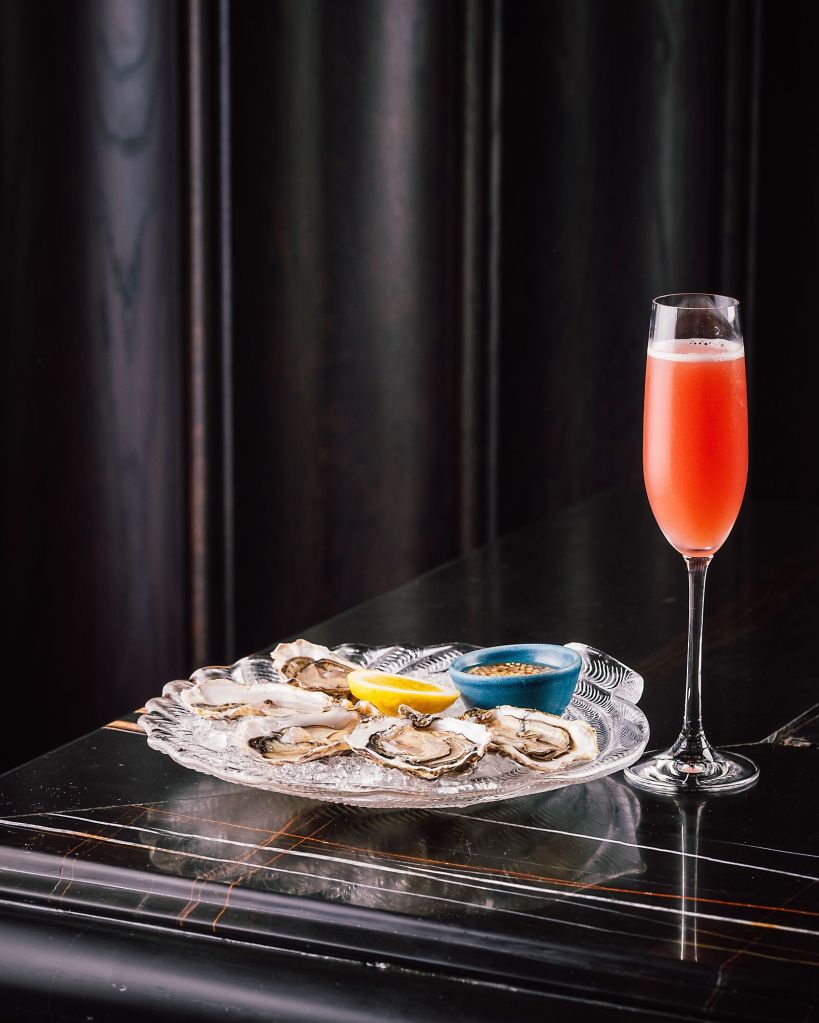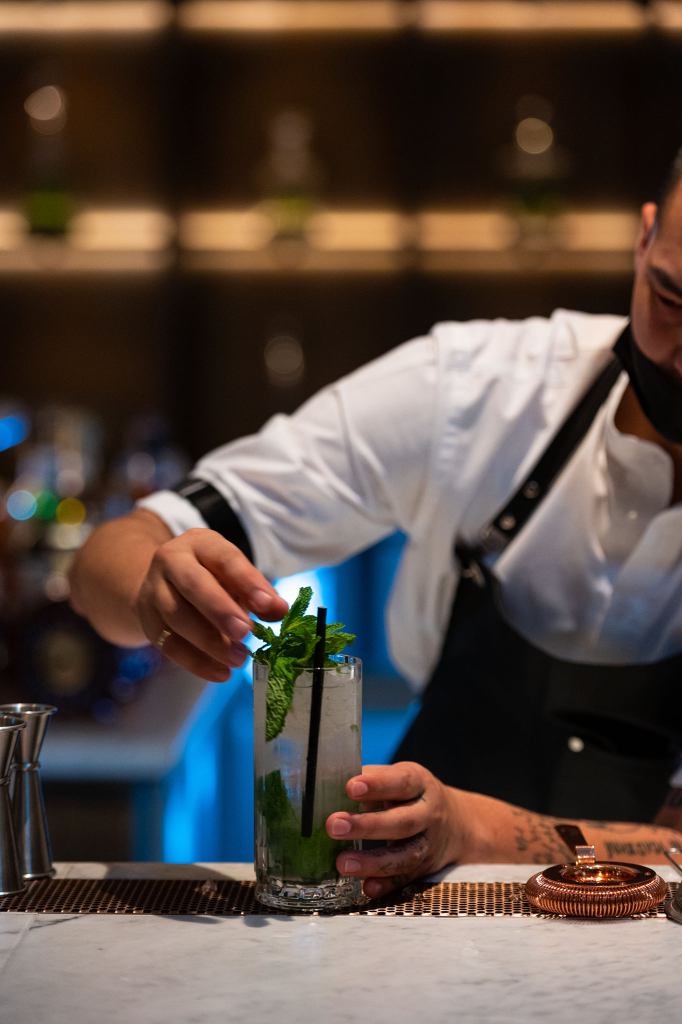 On the first floor, Jolie is a lively venue serving exquisite French cuisine inspired by Mediterranean coastal flavours. Here, wall to wall portraits inspired by Parisian high fashion sets the scene for an energetic, glamourous space to transition from morning to evening dining. The restaurant is filled with natural, earthy hues from the bronze finishes, tan hide leather chairs and the raised olive and gold bar chairs that line the ‘U’ shaped bar. Rattan and teak chairs are interspersed with olive-green banquettes, while parlour palms and tropical plants give a sense of privacy. Seamless Terrazzo flooring is the statement design element throughout the restaurant. On the semi-enclosed balcony-inspired terrace overlooking Old Town, artwork adorns the walls depicting urban living.