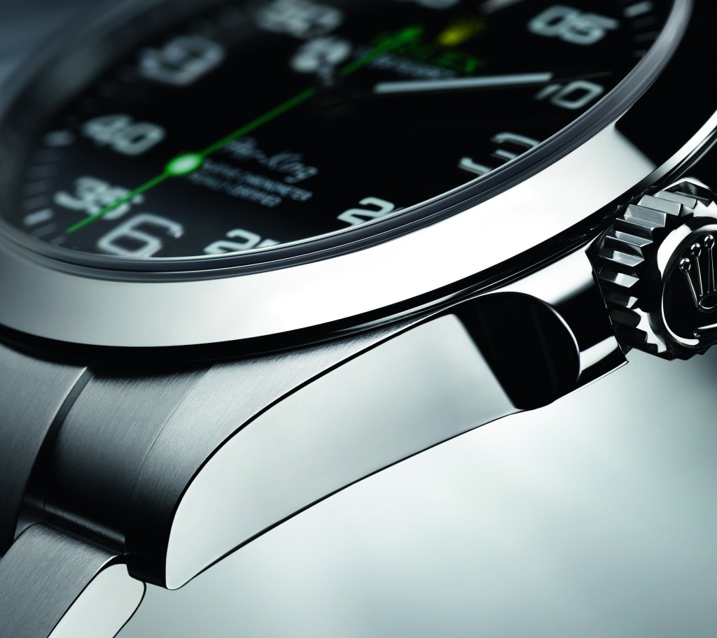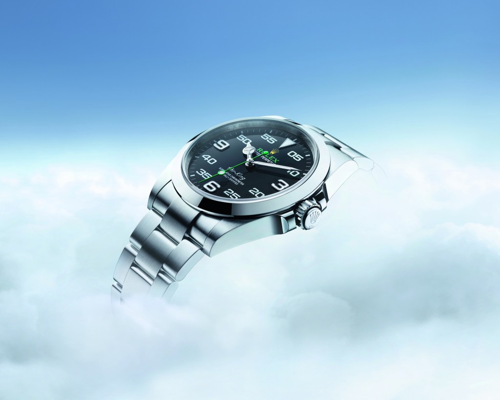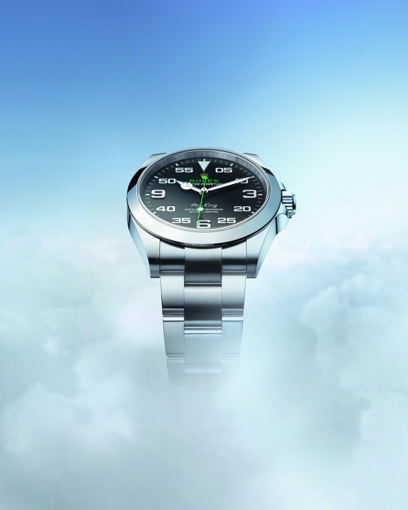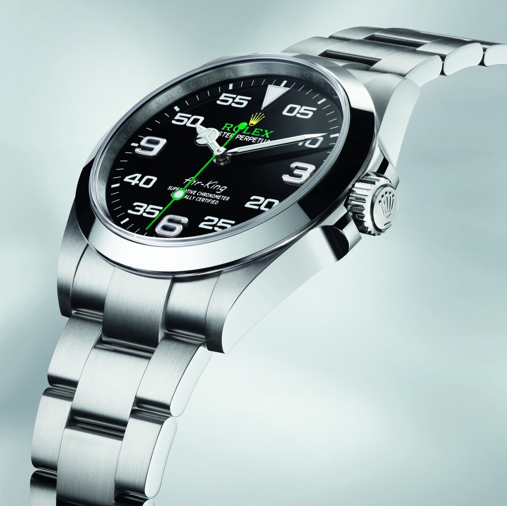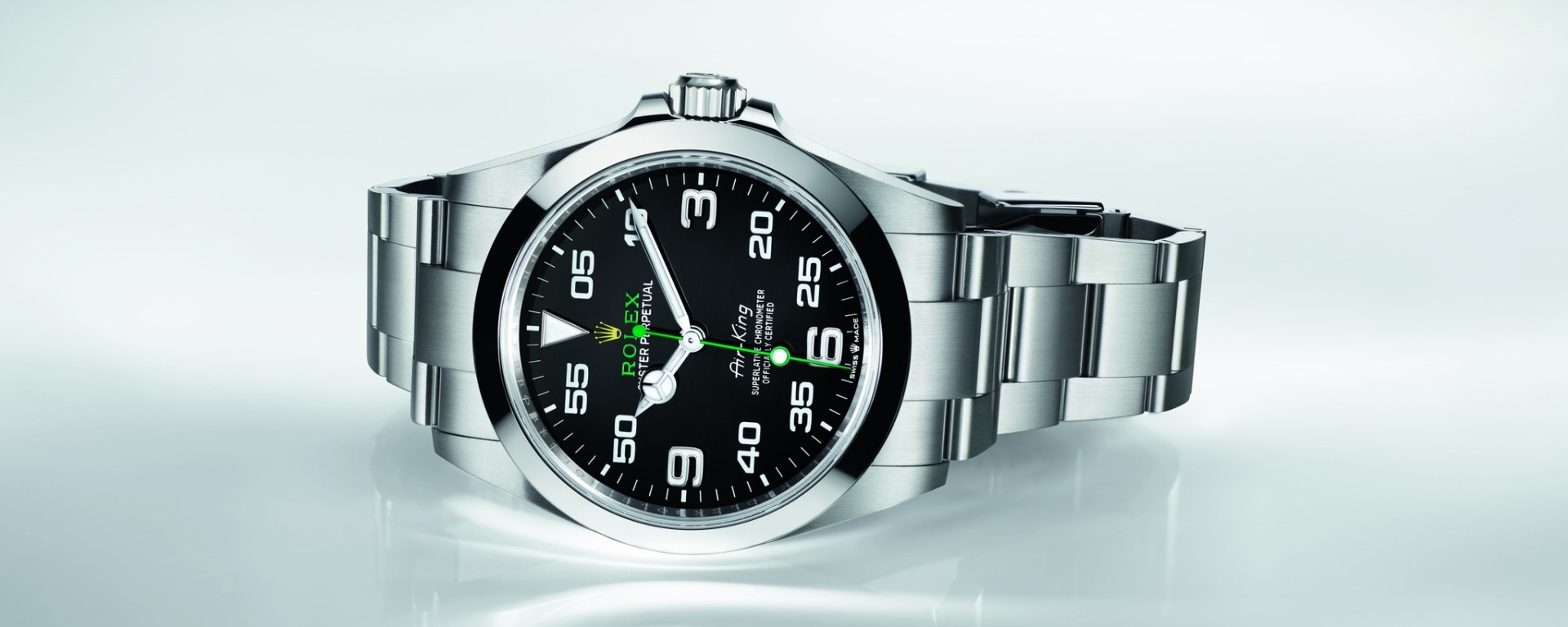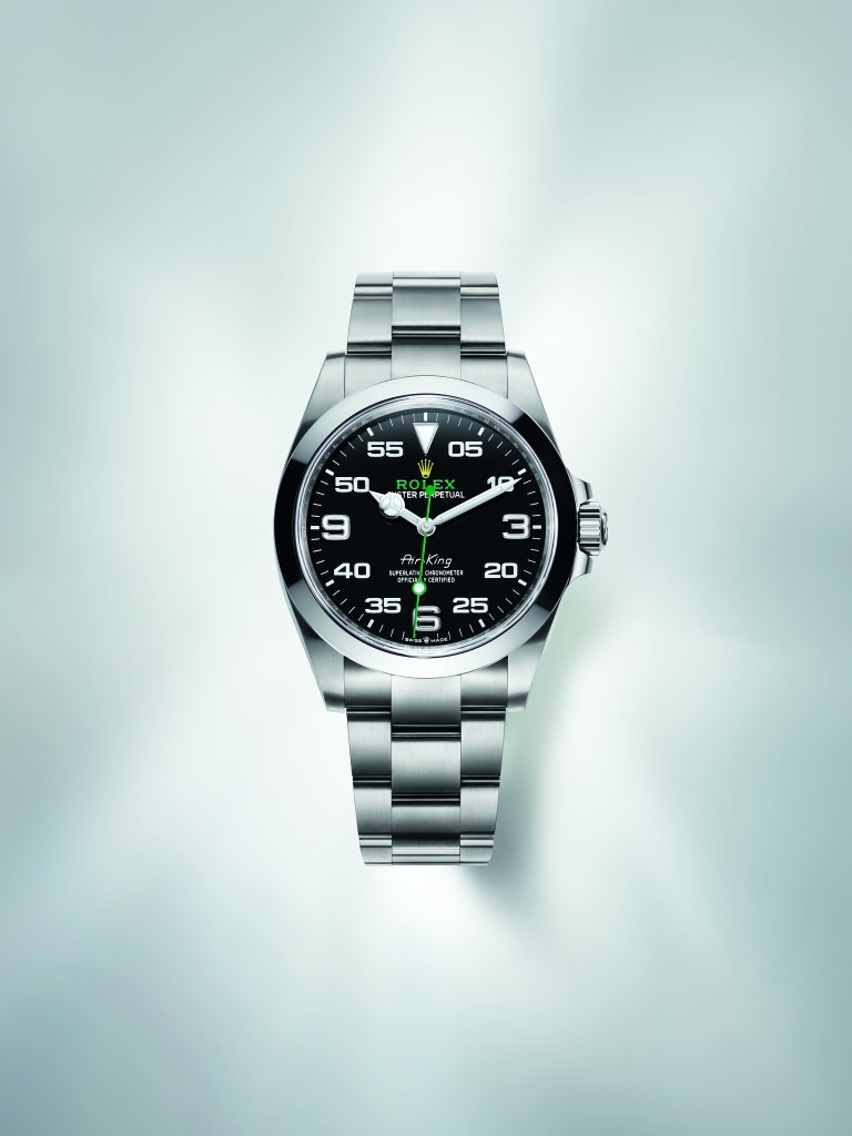 Like all Rolex watches, the Oyster Perpetual Air-King is covered by the Superlative Chronometer certification redefined by Rolex in 2015. This designation testifies that every watch leaving the brand’s workshops has successfully undergone a series of tests conducted by Rolex in its own laboratories according to its own criteria, following the official certification of the movements by the Swiss Official Chronometer Testing Institute (COSC). The in-house certification tests apply to the fully assembled watch, after casing the movement, guaranteeing superlative performance on the wrist in terms of precision, power reserve, waterproofness and self-winding. The precision of a Rolex Superlative Chronometer is of the order of −2/+2 seconds per day – the rate deviation tolerated by the brand for a finished watch is significantly smaller than that accepted by COSC for official certification of the movement alone.