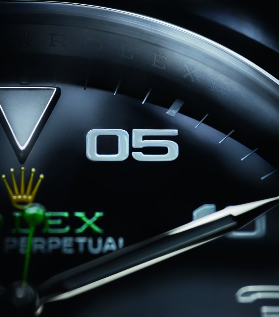 The new-generation Air-King benefits from an optimized Chromalight display, guaranteeing maximum legibility in dark conditions. The hands and triangular hour marker at 12 o’clock are filled or coated with a new luminescent material that provides a longer-lasting intense glow. The 3, 6 and 9 numerals, which were previously made entirely from 18 ct white gold, are now also visible in the dark as a result of the use of this innovative material, which is exclusive to Rolex.