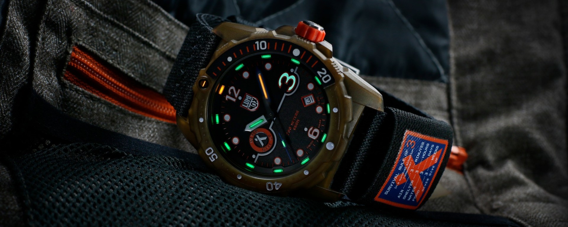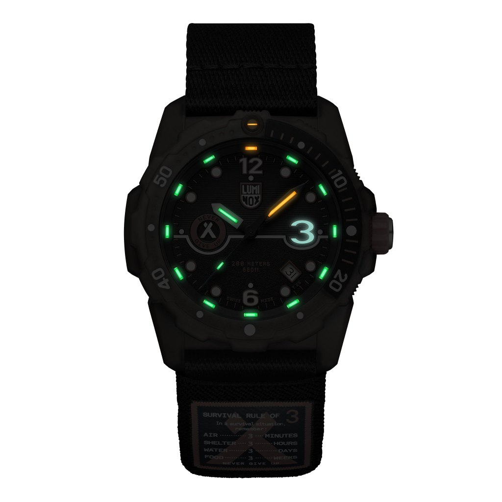 The special dial design includes an oversized ‘3’ on the dial, a nod to the survival rule, which is balanced by the Bear Grylls Never Give Up logo at 9 o’clock. As with every other Luminox timepiece, it incorporates the Luminox Light Technology, ensuring that the dial of the timepiece is visible in any lighting conditions. The model boasts a 45mm case and water resistance to 200 meters with Grylls’ signature orange crown.