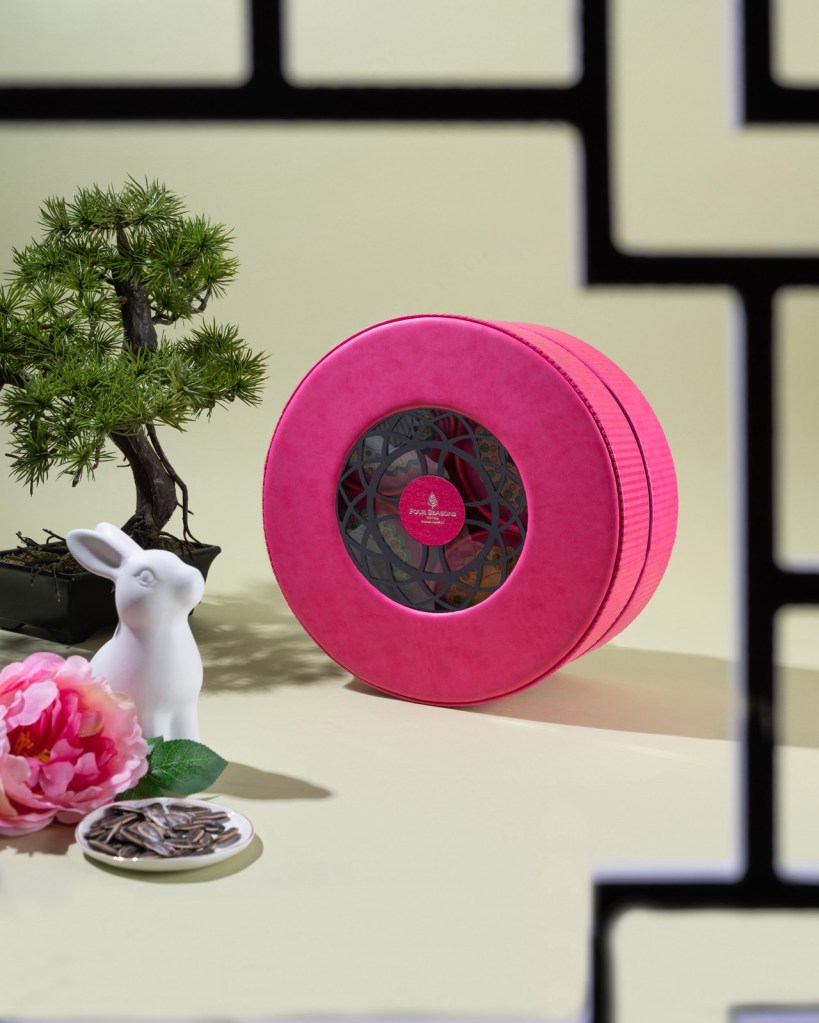 The exquisite mooncakes are handcrafted with the highest care and packaged in a custom Four Seasons gift box. Elegant lavender and joyful pink create a festive atmosphere, which is further enhanced by intricate festive symbols.