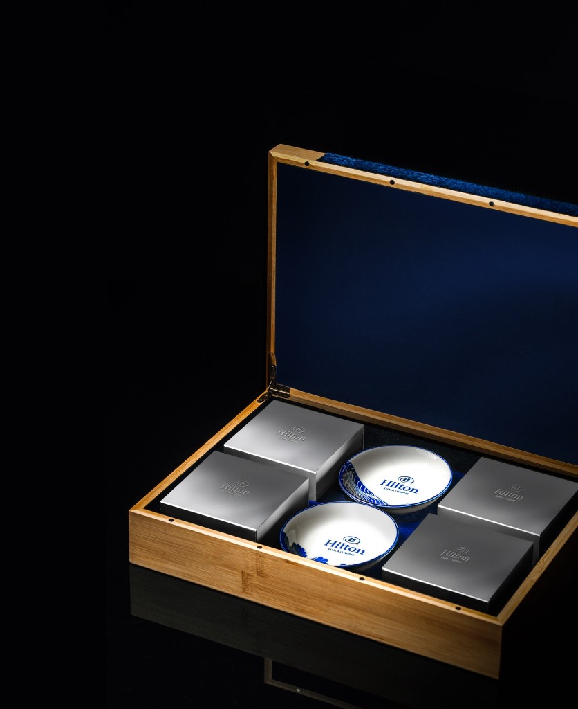 Featuring two opulent porcelain dishes with your choice of Hilton’s traditional baked or snow skin mooncakes, this bamboo box is a celebration of timeless materials and modern tastes. The eco-chic design features a Hilton logo on a steel plate and a lid that is adorned with a velvet panel. On the inside, the box is fully lined with velvet fabric to safely cushion the premium goods.