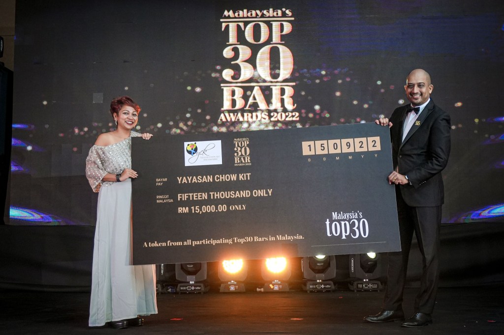 At the awards ceremony, Yayasan Chow Kit received a donation from Malaysia’s Top 30 Bar Awards, which raised RM15,000 for charitable causes. Yayasan Chow Kit’s CEO, Ananti Raj, accepted the mock check on the company’s behalf.