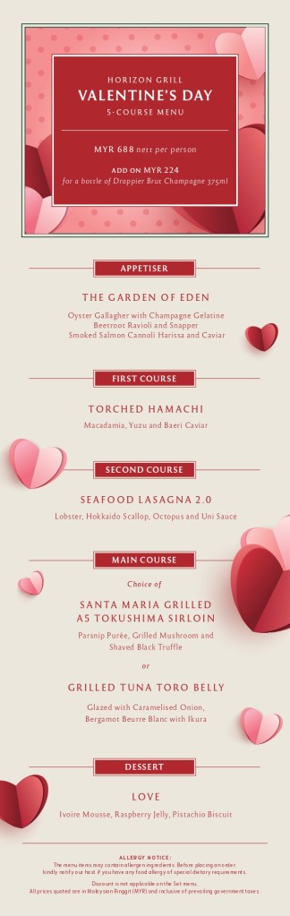 Horizon Grill at Level 58 of Banyan Tree Kuala Lumpur offers panoramic views of Kuala Lumpur’s city lights and a gastronomic 5-course Valentine’s journey curated by Horizon Grill’s passionate Chef Francesco Fedrighi for dinner from 12 to 14 February 2023. Priced at MYR 688 nett per person (add MYR 224 nett for a mini bottle of Drappier Brut Champagne 375ml), the menu includes The Garden of Eden – Oyster Gallagher with Champagne Gelatine Beetroot Ravioli and Snapper Smoked Salmon Cannoli Harissa and Caviar; Santa Maria Grilled A5 Tokushima Sirloin – with Parsnip Purèe, Grilled Mushroom and Shaved Black Truffle and for dessert Love – Ivoire Mousse, Raspberry Jelly, Pistachio Biscuit.