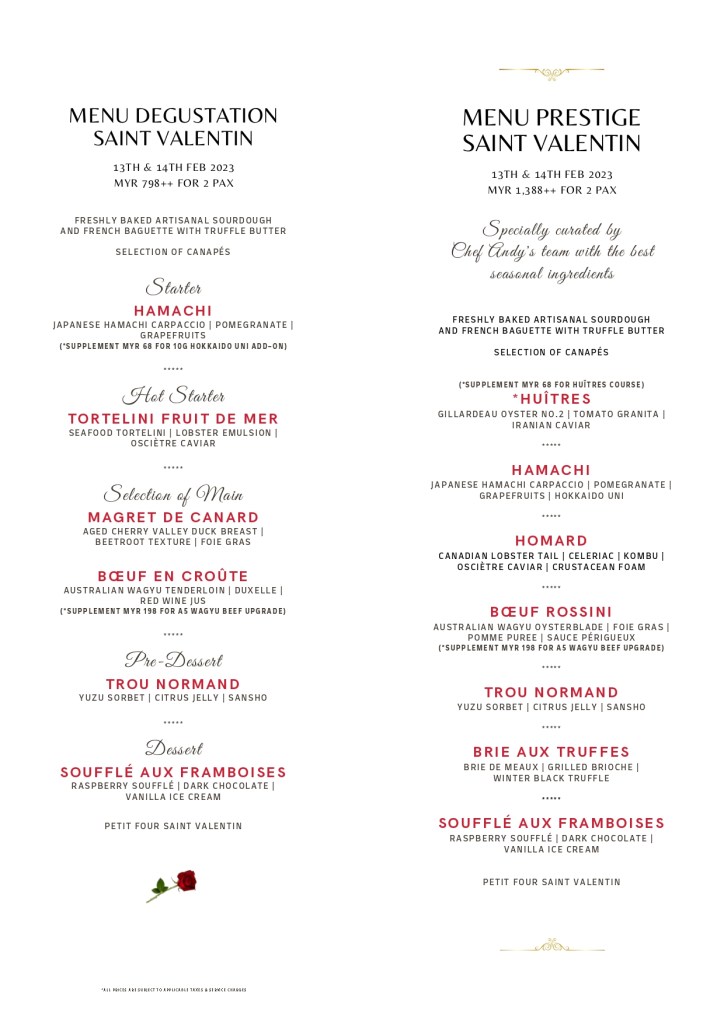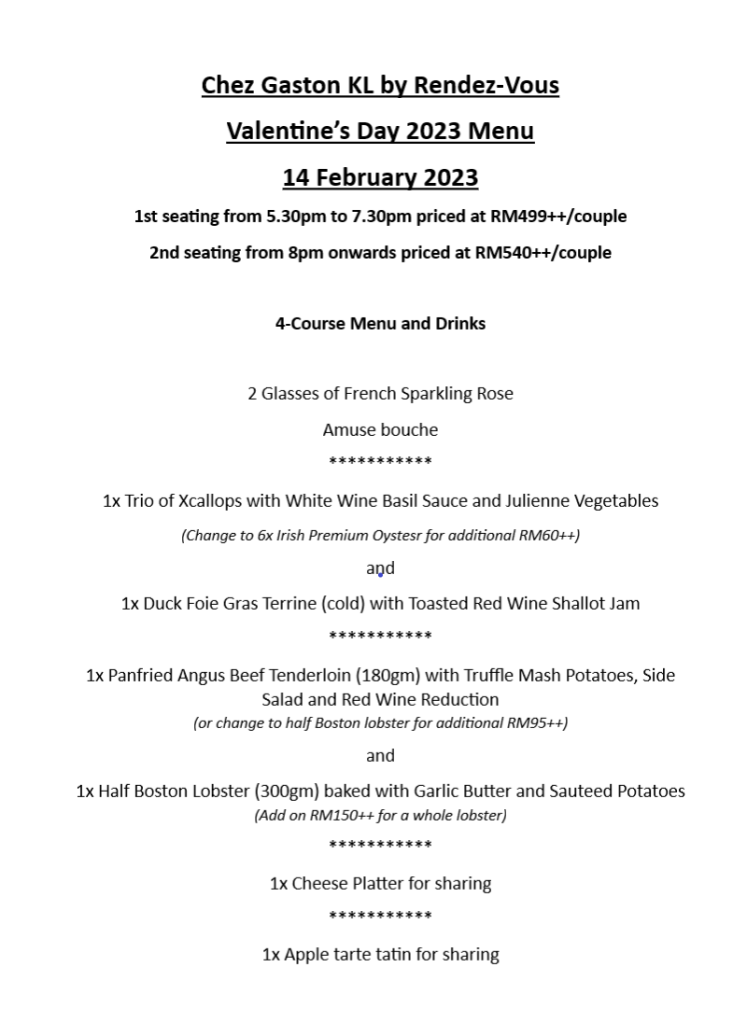 Chez Gaston KL by Rendez-Vous will be offering a 4-course Valentine’s Day menu inclusive of two (2) Glasses of French Sparkling Rose for 2 pax on 14 February 2023. There will be two seatings with the first seating from 5.30pm to 7.30pm priced at RM499++/couple, and the 2nd seating from 8pm onwards priced at RM540++/couple.