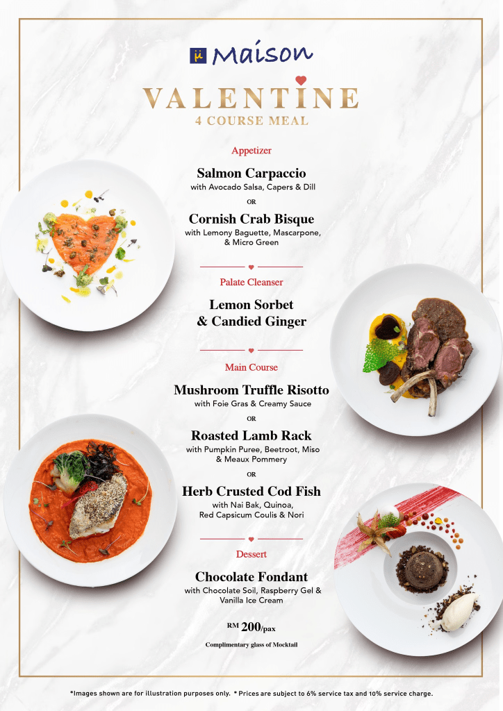 Maison’s romantic 4-course Valentine’s Day menu is priced at RM200+ per pax inclusive of a glass of Mocktail or House Pour (House Pour Wine is Available at Maison Bistro only).
