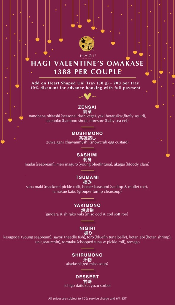 Love is always worth celebrating. Pamper your loved one at Hagi Japanese Cuisine in Taman Tun Dr. Ismail with an exquisite Valentine’s Omakase priced at RM1,388++ per couple. You can also opt to add on RM200 for a special 50g heart-shaped uni tray. Book in advance with full payment to enjoy a 10% discount. This set is available on 14 and 15 February 2023, with 2 dining slots available from 6pm to 8pm, or 8pm to 10pm.