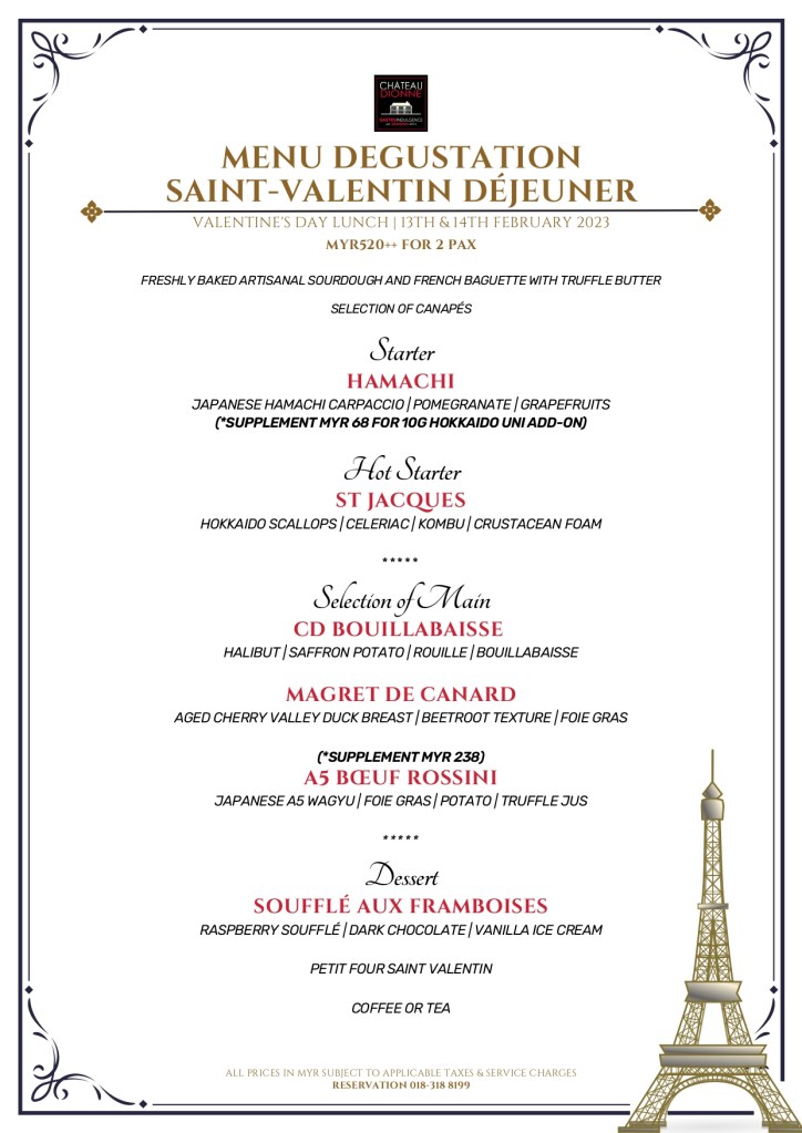 Celebrate love at Chateau Dionne Kuala Lumpur this Valentine’s Day! Chateau Dioner Kuala Lumpur has three Saint Valentin menus specially curated by Executive Chef Andy Choy and the culinary team. Indulge your senses in the Lunch, Degustation and Prestige Valentine’s Day 2023 menus which are available on 13 and 14 February 2023.