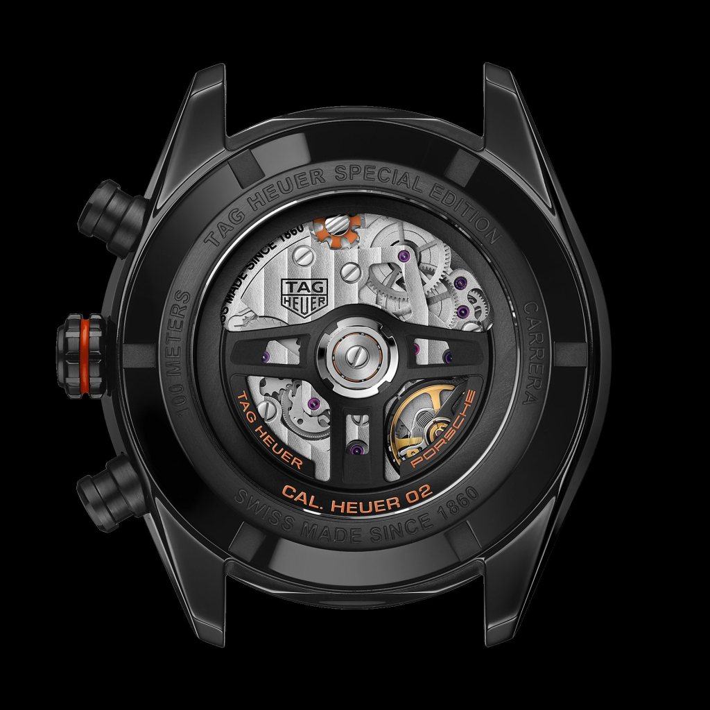 TAG Heuer Carrera Chronograph x Porsche Orange Racing is based on the iconic TAG Heuer Carrera Sport Chronograph and follows the TAG Heuer Carrera x Porsche Limited Edition. It retains the quality and performance of the in-house Calibre Heuer 02, a movement comprised of 168 components built solely at TAG Heuer’s Chevenez plant, including a column wheel and a vertical clutch. These characteristics enable exceptional chronometric performance and provide a remarkable power reserve of 80 hours.