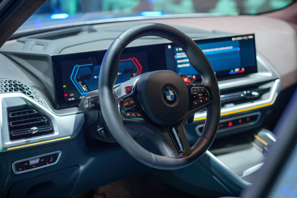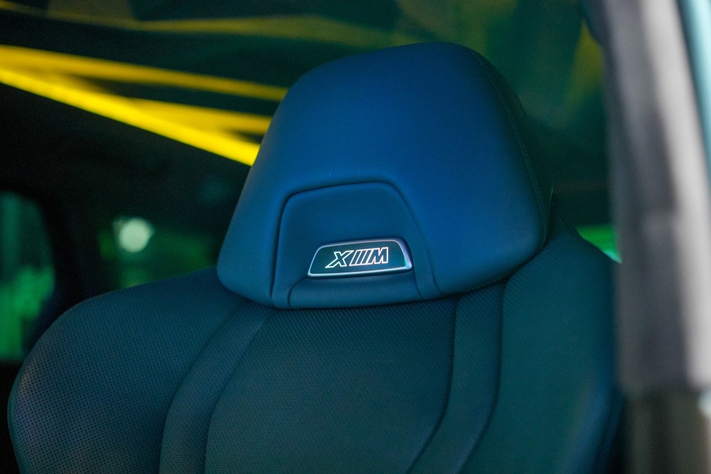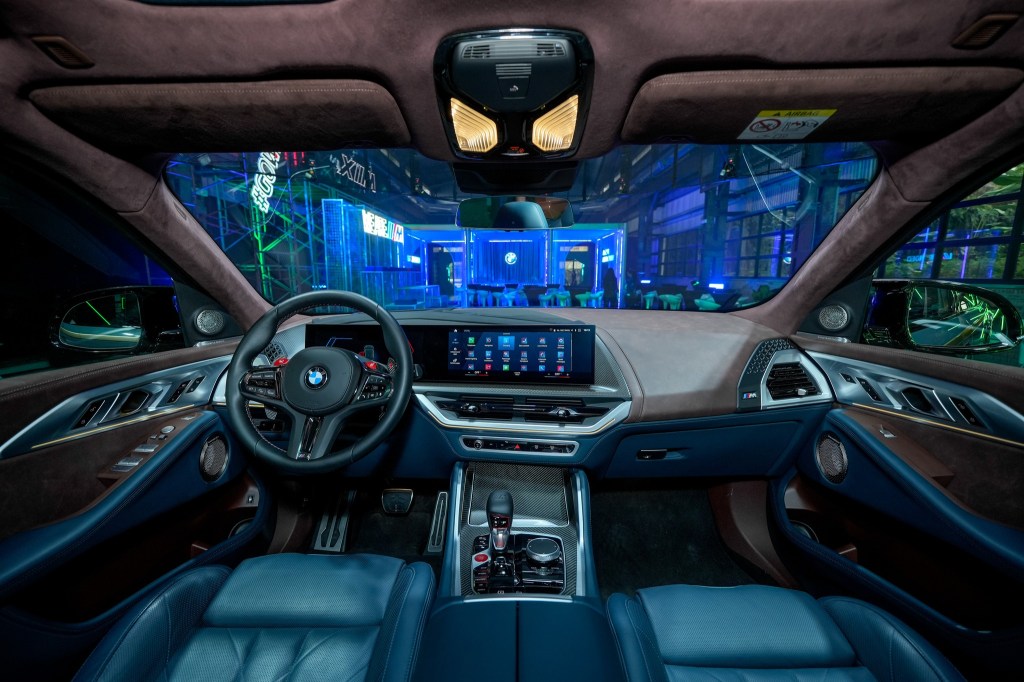 The BMW XM”s interior features carbon-fiber interior trim finishers, with a cabin defined by the BMW Curved Display, which consists of an Information Display and a high-resolution touchscreen Control Display. A familiar BMW driver orientation, as well as BMW M-specific displays, ensure that the driver always has complete control over all driving functions and data. The M Leather Steering Wheel, M Seat Belts, and M Multifunctional Seats visually denote the SAV’s M status.