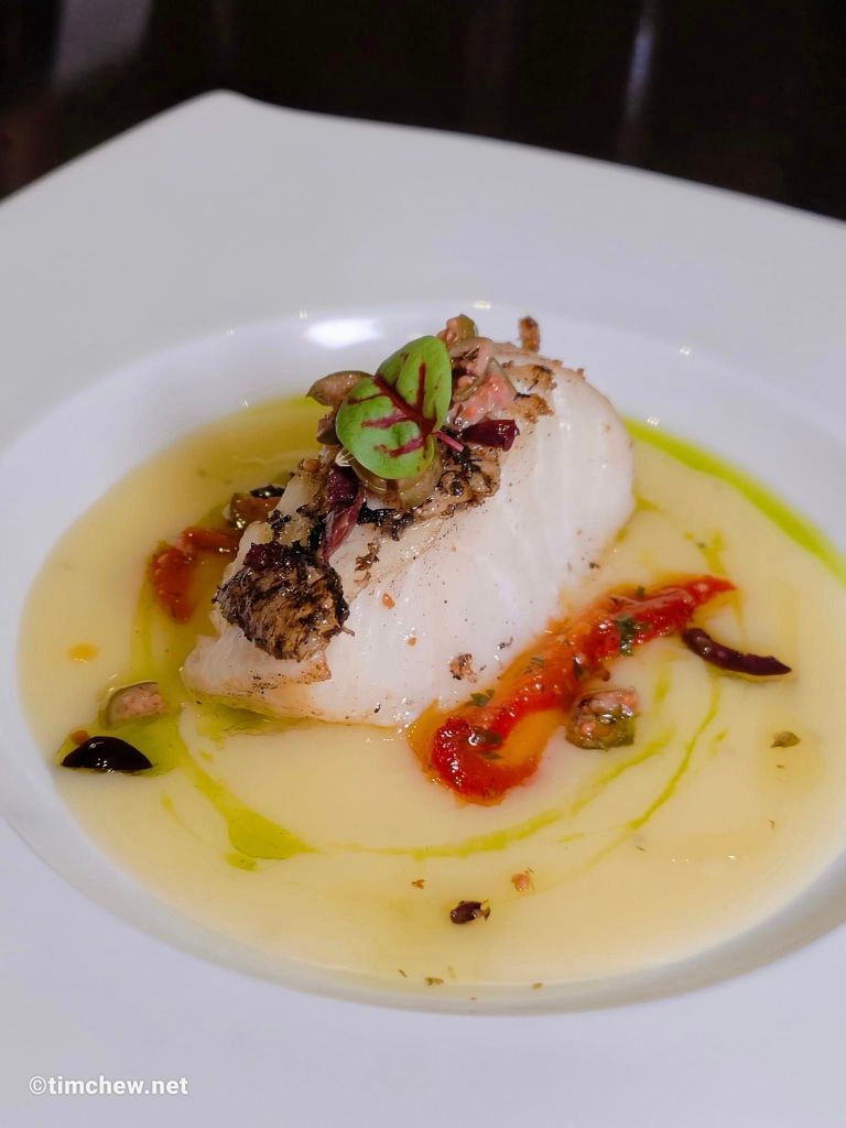 SECONDI – MERLUZZO IN PADELLA: Atlantic Cod, Potato Cream, Bell Pepper, and Oregano-Capers Oil come together to create a symphony of flavours and textures that exemplify Italian culinary artistry.