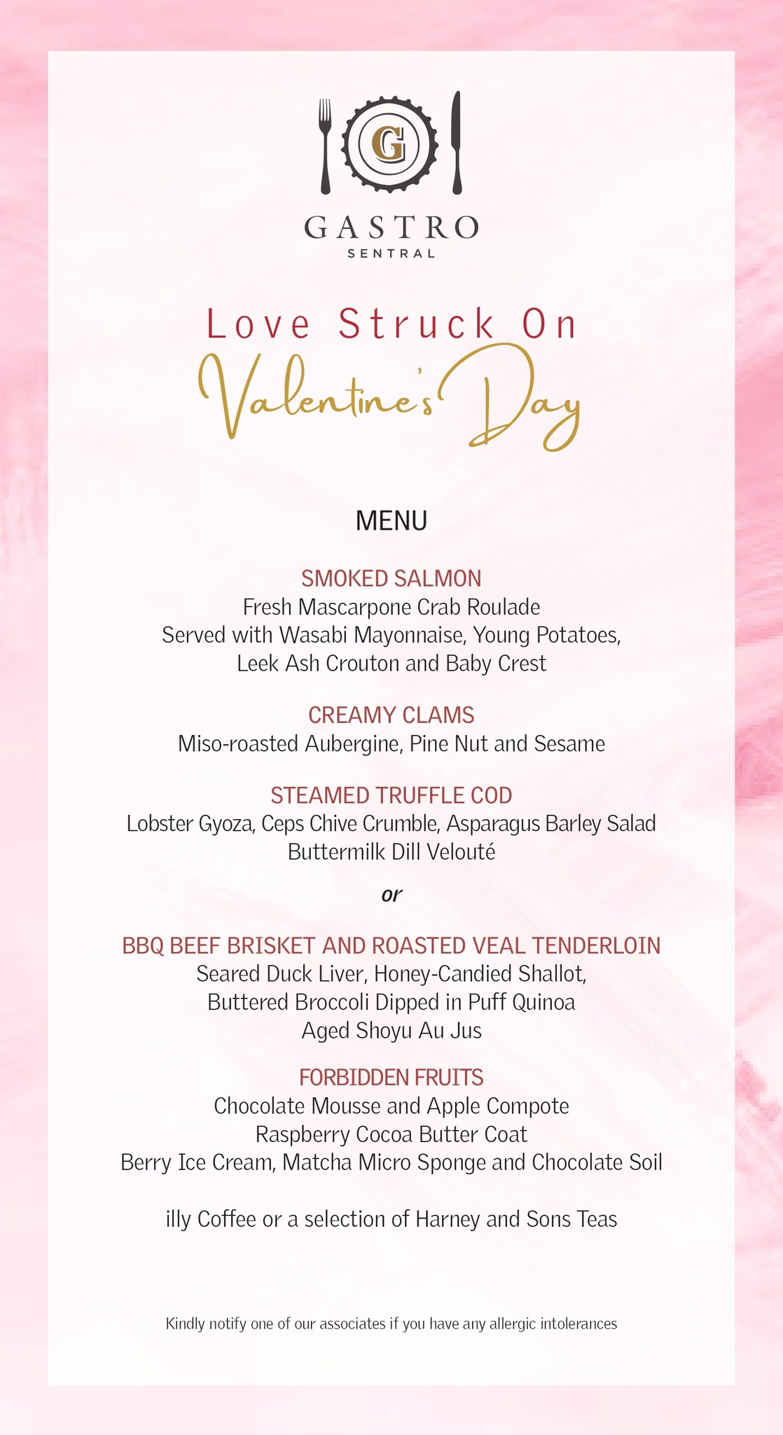 To further elevate your romantic celebration, each couple will be treated to a welcome cocktail and a glass of house pour wine, weaving the perfect harmony for an unforgettable evening. After dinner, stay back for a romantic live music performance by Tony & Albert.