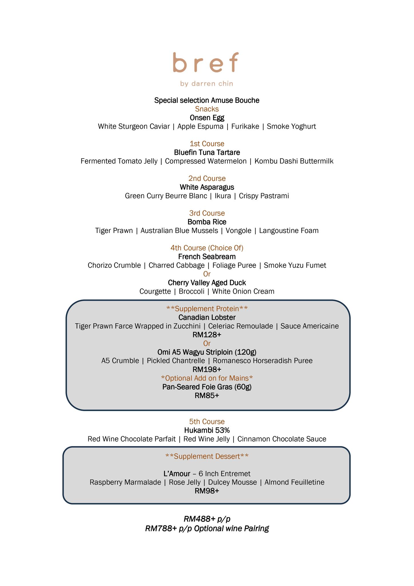 Whispers of romance fill the air at Bref this Valentine’s Day, inviting you and your cherished one to create an unforgettable evening steeped in culinary artistry and heartfelt moments. On February 14th, 2024, embark on a delectable journey with the exclusive 5-course Valentine’s Day menu, priced at RM488++ per person, or indulge in an unparalleled experience with the wine pairing option for RM788++ per person.
