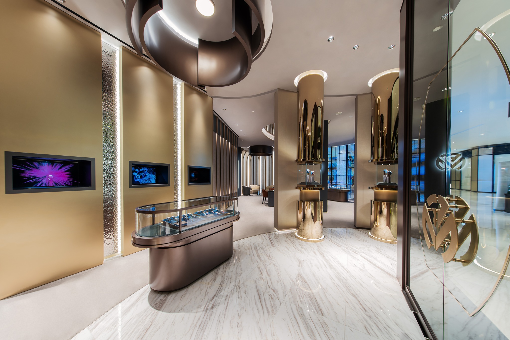 Originally opened in 2021, the boutique has undergone a meticulous transformation, boasting a fresh and luxurious interior that effortlessly blends modern sensibilities with a touch of opulence. Neutral colour palettes create a calming canvas, accented by signature Franck Muller navy blue and champagne gold, exuding an air of timeless sophistication. The exterior itself is a captivating invitation, featuring a curved LED screen that acts as a visual jewel, drawing passersby in to explore the wonders within. Upon entering the double-door glass entrance adorned with the iconic Franck Muller emblem, one is immediately greeted by a world of warmth. Lavish interiors bathed in soft light showcase holographic displays and a stunning collection of Franck Muller’s most coveted timepieces. This flagship boutique transcends the boundaries of a simple store, offering a truly immersive experience where architectural brilliance seamlessly blends with cutting-edge design.