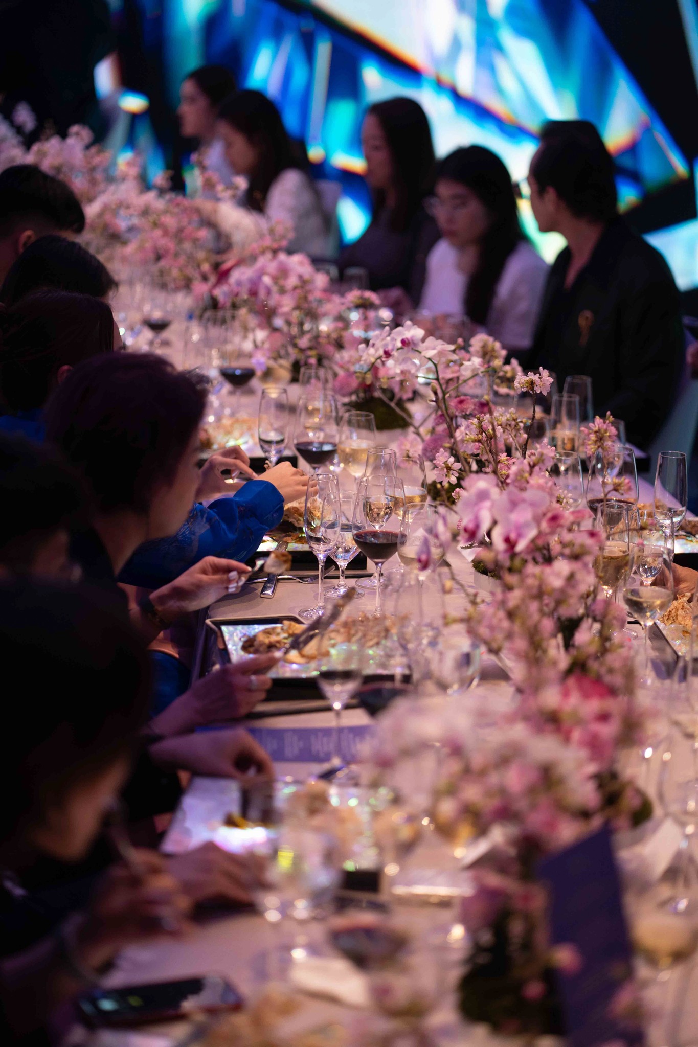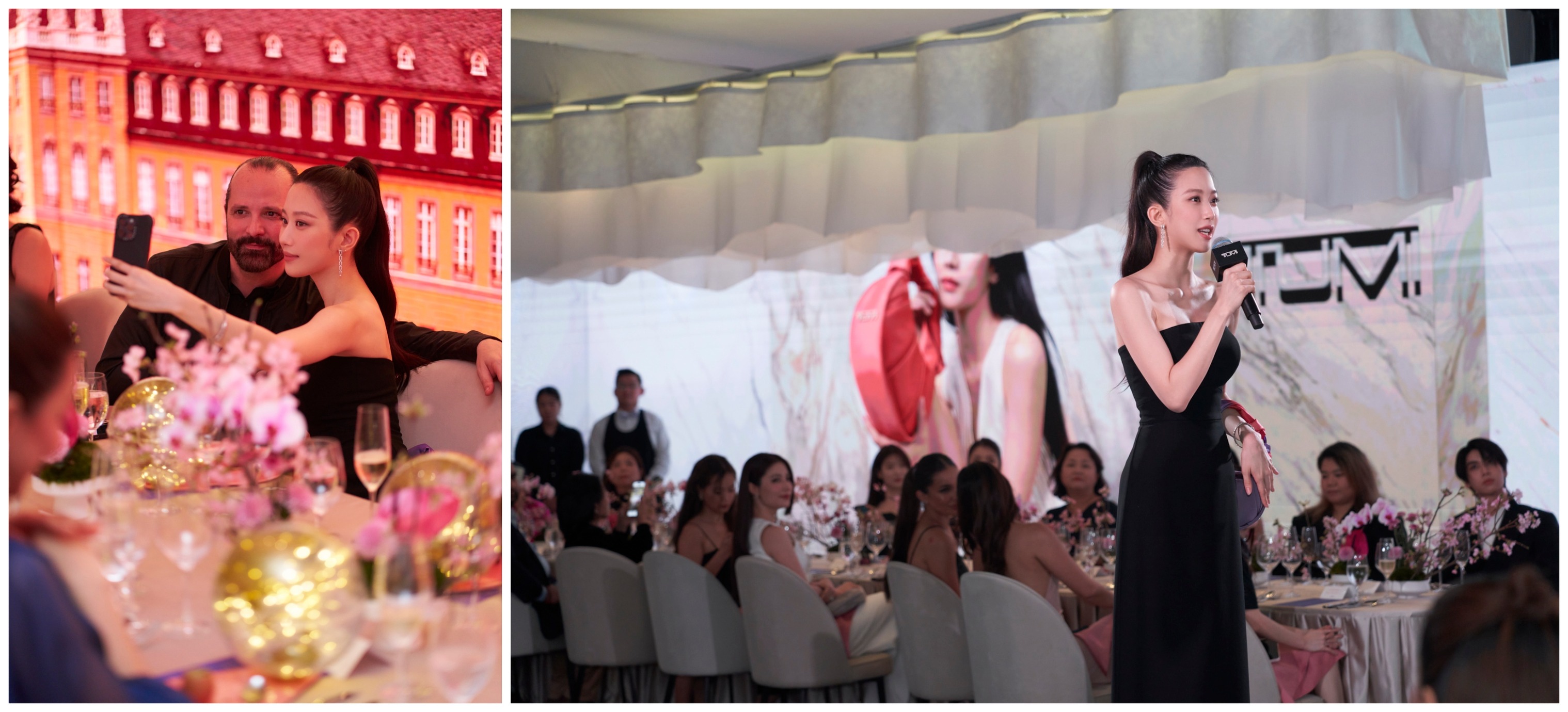 Arriving in the dining room, guests took their seats at long tables positioned around the edge of the room. LED panels along the walls served as a canvas for the evening’s expansive storytelling, celebrating the partnership between TUMI and Mun. TUMI’s Creative Director Victor Sanz personally welcomed VIPs and officially introduced Mun, adding a touch of warmth and excitement to the event.