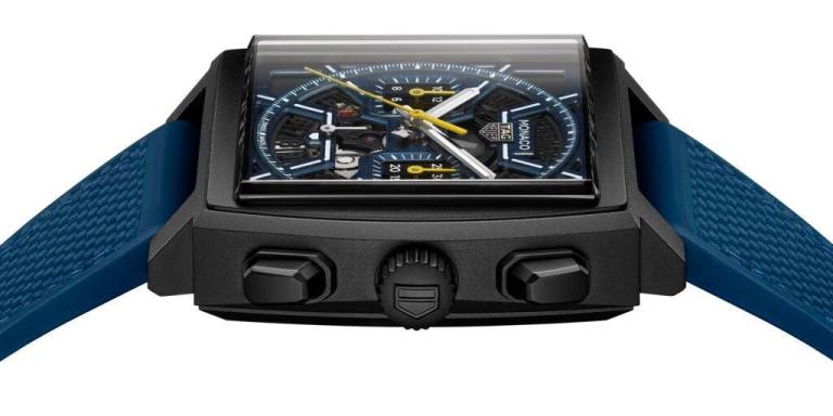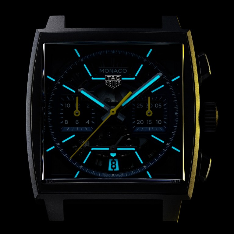 The TAG Heuer Monaco Chronograph reflects the Maison’s commitment to precision engineering and avant-garde aesthetics. Its skeleton dial offers a glimpse of the watch’s sophisticated mechanics, highlighting the automatic Calibre Heuer 02 that powers it, ensuring impeccable timing precision with an impressive 80-hour power reserve. The watch’s dark blue theme pays tribute to the Principality of Monaco’s racing tradition, with a contemporary twist that pays homage to the Mediterranean coast which hosts one of the world’s most prestigious races. The touches of yellow on the hands and hour markers provide a vibrant contrast, evoking the sparks that fly from racing cars at high-speed and adding a dynamic element to the overall design.