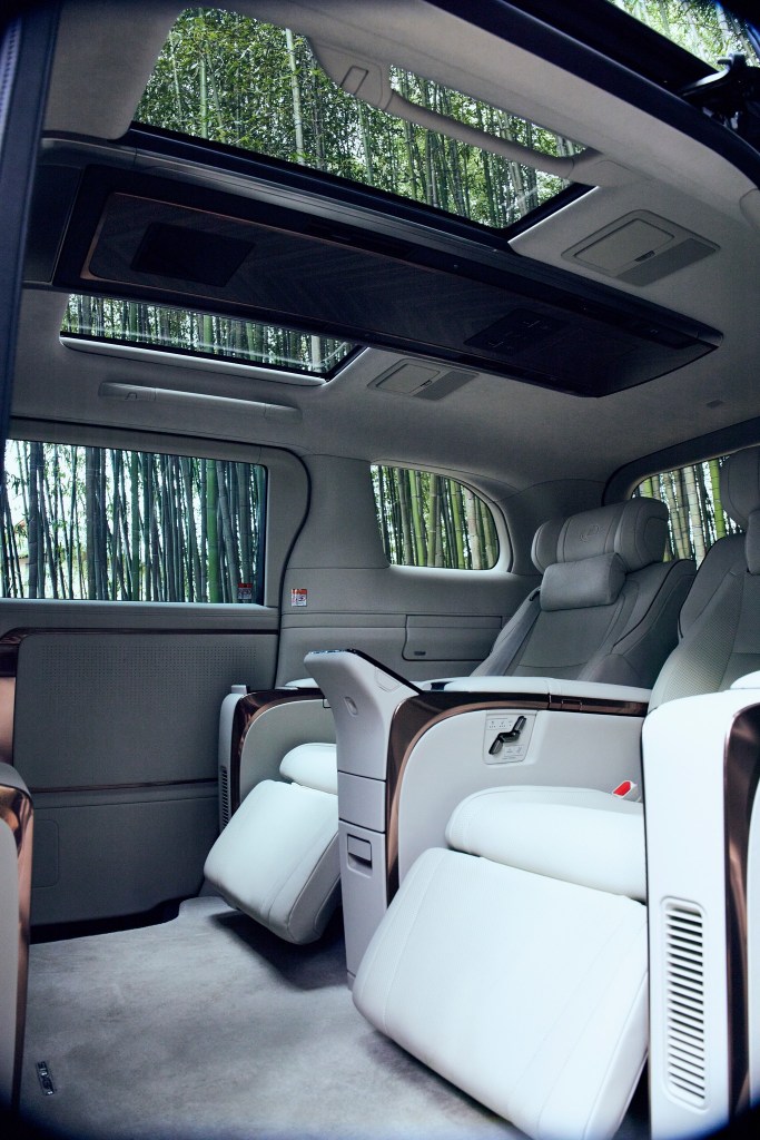 Thoughtful features throughout the cabin enhance the passenger experience. A built-in thermistor ensures a comfortable grip on the steering wheel, while an independent glass roof with integrated sunshade allows for an open and airy feel in the rear passenger compartment. Each rear passenger has their own multi-operation panel for controlling air conditioning, seat posture, and lighting, ensuring maximum comfort and individual control. The LM500h takes entertainment and productivity to the next level with a massive 48-inch ultrawide display featuring dual-screen functionality, perfect for watching movies, working on presentations, or simply enjoying a variety of multimedia content on the go.