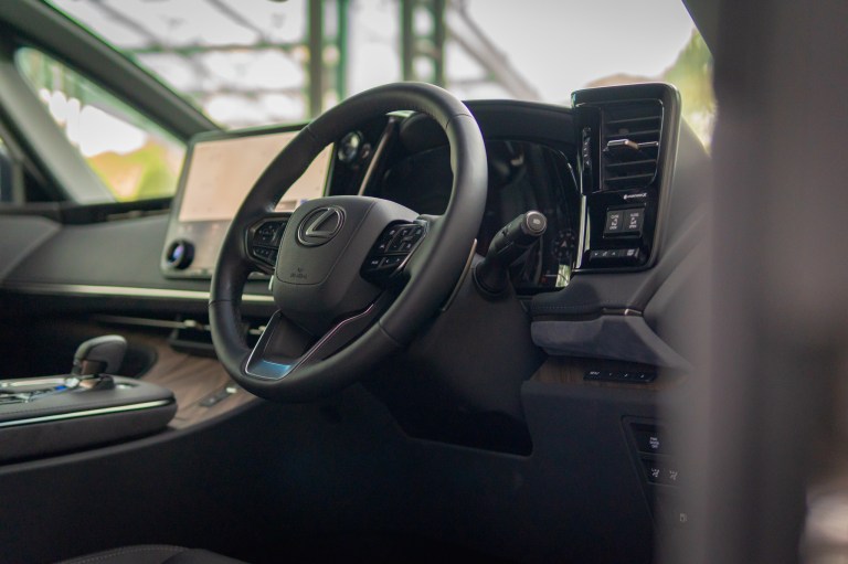 High-performance LED projector headlights blend seamlessly with the Spindle Grille, and the signature L-shaped daytime running lights add a touch of Lexus flair. For a touch of luxury and convenience, Omotenashi illumination automatically activates the clearance lamps as you unlock the doors. Both rear passenger sliding doors now feature an easy-to-use “see-saw” switch for improved passenger access, while the front door handles boast an e-Latch System with SEA (Safe Exit Assist) to warn of approaching vehicles from behind.