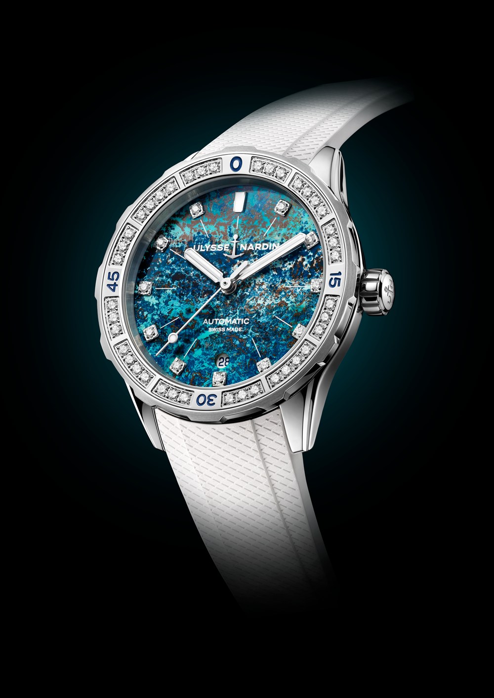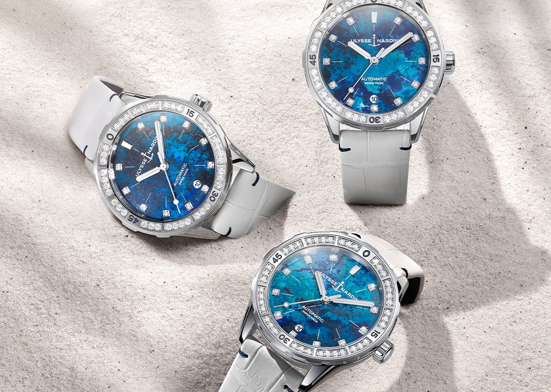 The Diver Atoll boasts a striking chrysocolla dial, a gemstone renowned for its mesmerizing blue and turquoise hues, punctuated by swirls of brown and black. Each dial is meticulously hand-cut, resulting in a unique piece that evokes the allure of tranquil lagoons and vibrant coral reefs. This marks the latest in Ulysse Nardin’s series of gem-set Diver models, showcasing the brand’s mastery in overcoming technical challenges to create exceptional timepieces.