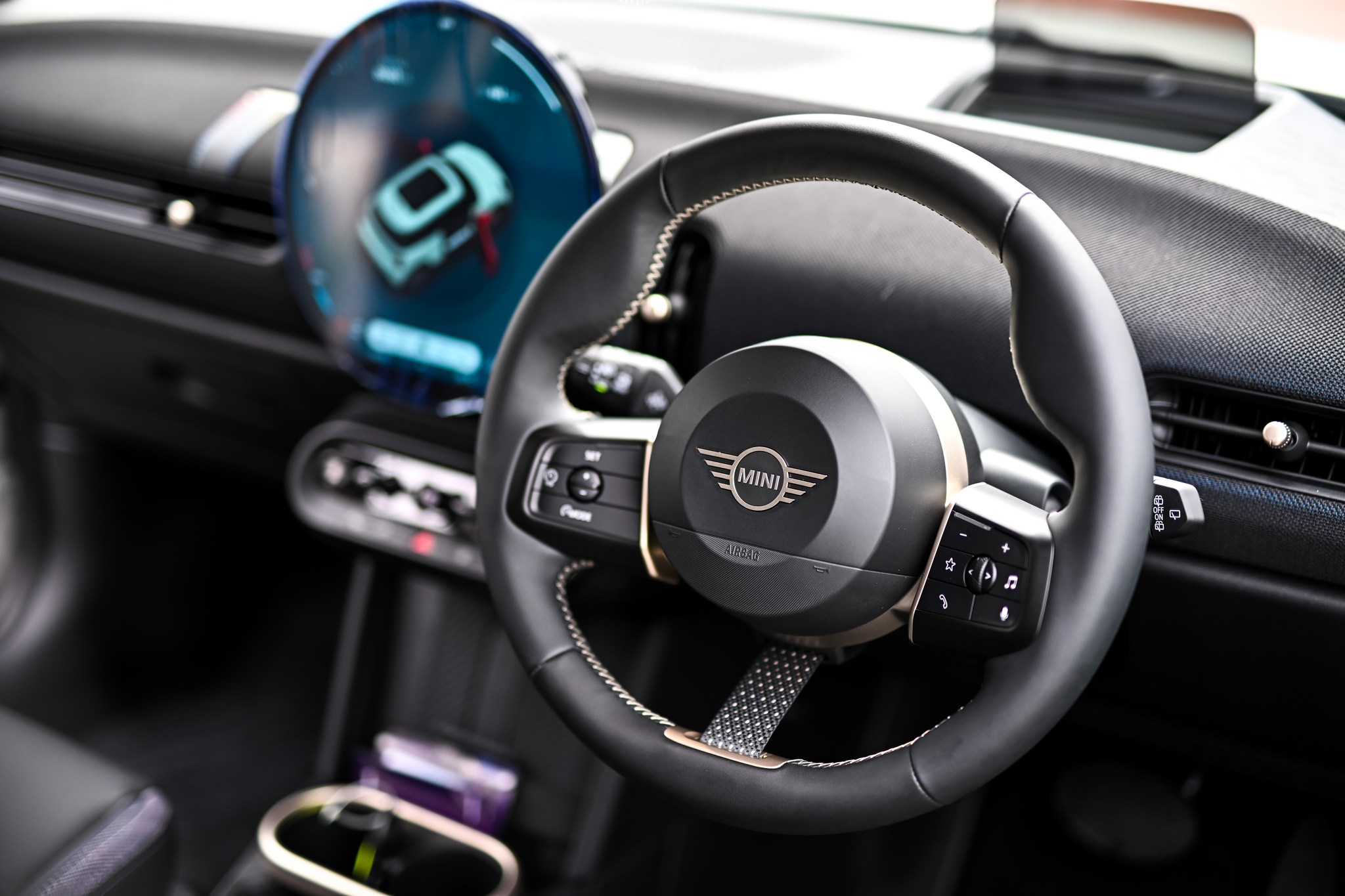 Stepping inside the New MINI Cooper SE, the focus is on clean lines and high-quality materials that create a premium feel. The driver is greeted by a three-spoke sport steering wheel and a MINI Head-Up Display that projects essential information directly in their line of sight. A round, 240mm OLED display serves as the central hub for various controls, surrounded by high-quality materials for a cozy and pleasant atmosphere. The redesigned center console offers increased storage capacity and improved ergonomics, making everything within easy reach.