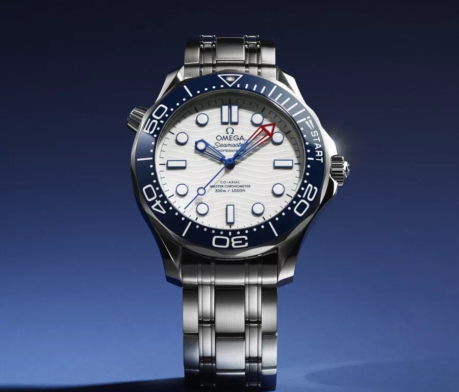 The new Seamaster Diver 300M America’s Cup edition is a 42 mm stainless steel masterpiece that combines the robust functionality of a dive watch with specific features tailored for competitive sailing. The watch boasts a blue ceramic unidirectional bezel with a regatta scale, featuring two 5-minute pre-start sections and a START section adorned with a regatta-inspired flag.
